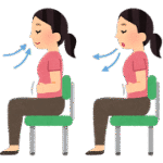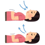 ・腹式呼吸をする。(息を吐くときは、おなかがへこみ、息を吸うときは、おなかが膨らみます。)おなかに手を当てるとやりやすいですよ。あるいは、あおむけに寝た姿勢で行うと、自然に腹式呼吸になります。